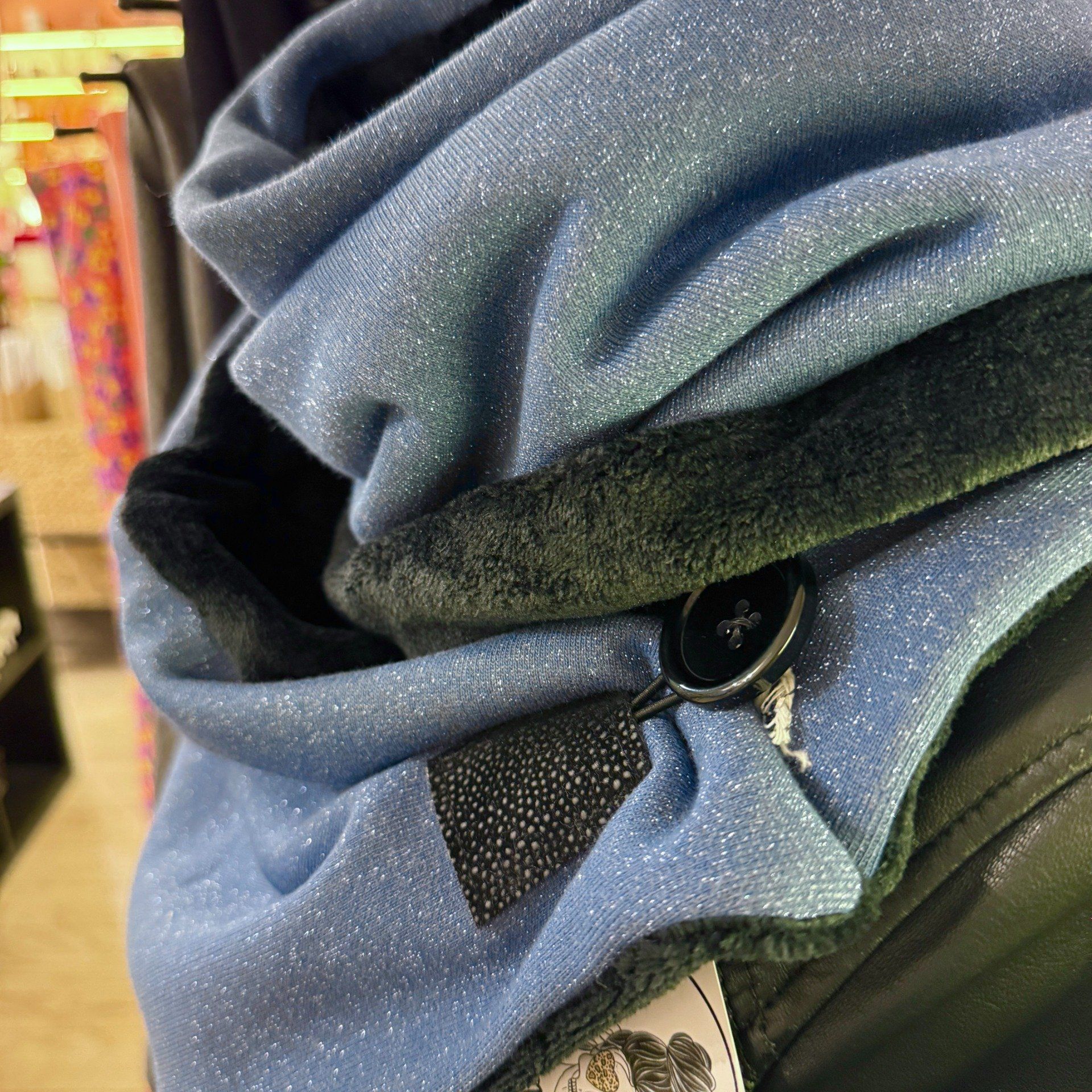 Pour la confectionner, j'ai découpé 2 rectangles de tissus que j'ai assemblé. J'ai rajouté un gros bouton assorti et j'ai également réalisé une découpe dans du simili cuir noir que j'ai cousu avec un élastique à l'intérieur qui permettra d'accrocher le bouton. Je fais toujours les finitions à la main pour proposer un travail de qualité et soigné.