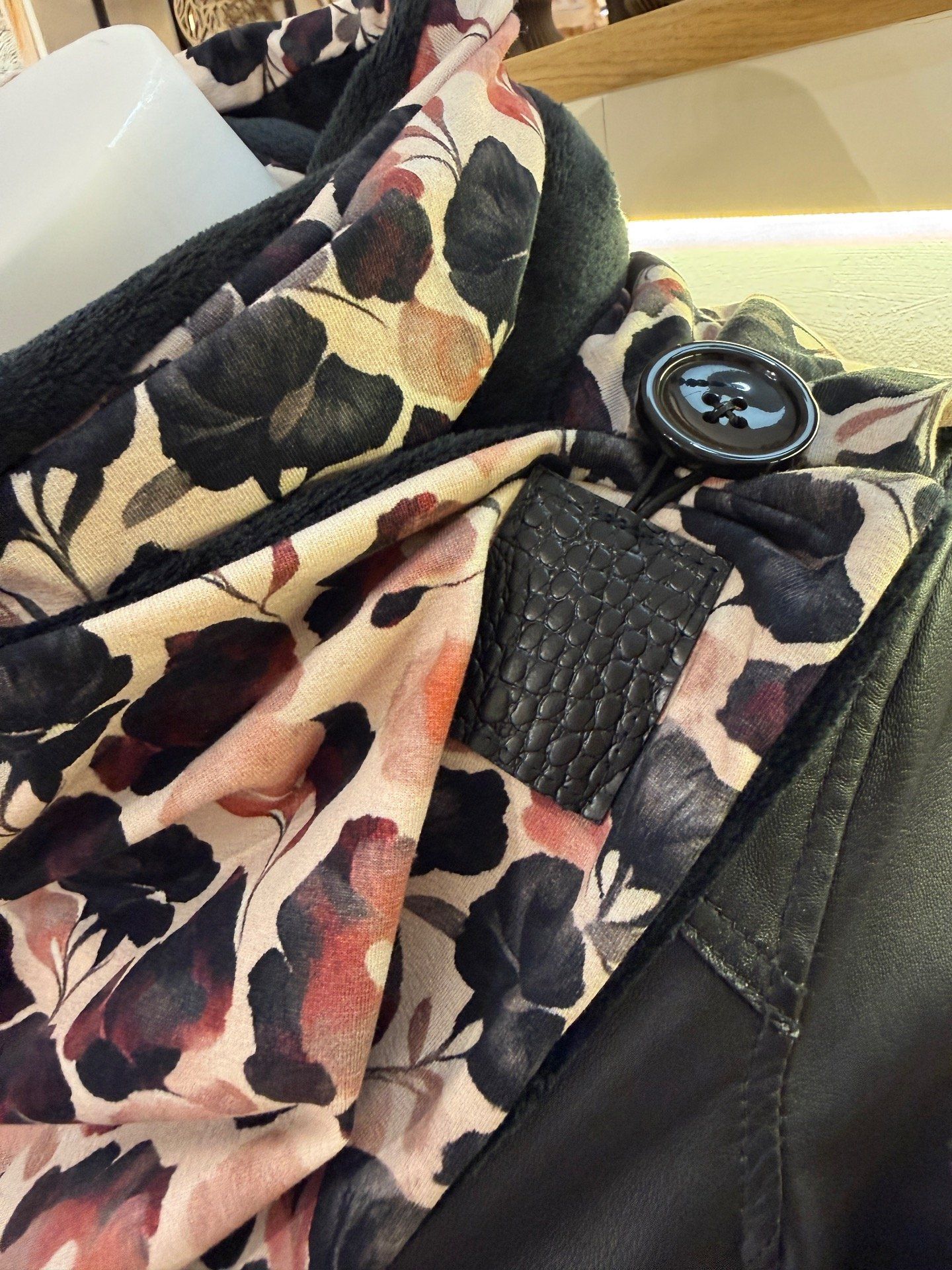 Pour la confectionner, j'ai découpé 2 rectangles de tissus que j'ai assemblé. J'ai rajouté un gros bouton assorti et j'ai également réalisé une découpe dans du simili cuir noir que j'ai cousu avec un élastique à l'intérieur qui permettra d'accrocher le bouton. Je fais toujours les finitions à la main pour proposer un travail de qualité et soigné.