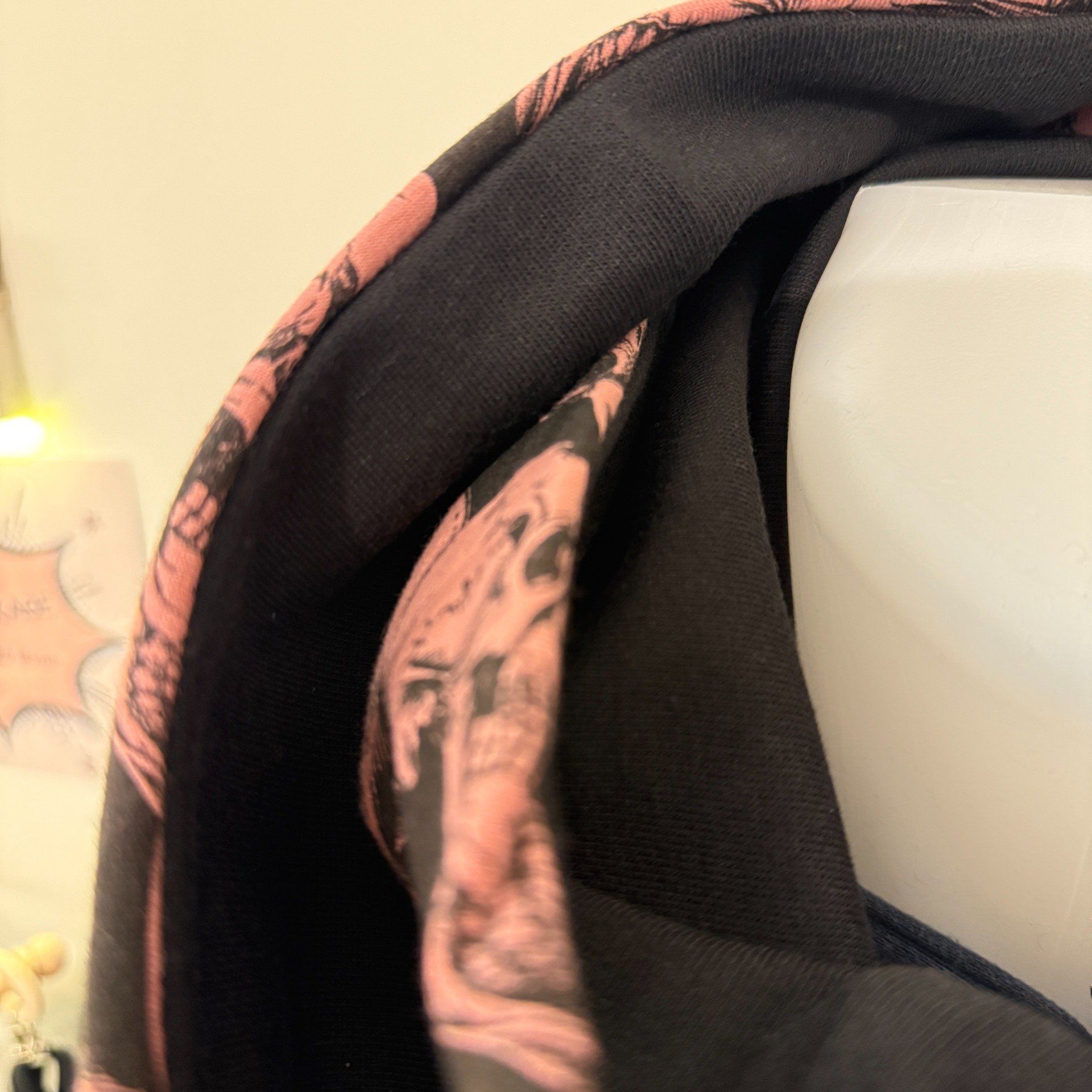 Pour le confectionner, j'ai découpé 2 rectangles de tissus que j'ai assemblé à la surjeteuse pour un rendu plus net. Un coté tout doux en douillette hyper agréable sur la peau et un coté pour le style, avec des tissus que je choisis selon mes envies, toujours dans l'objectif de te proposer des motifs originaux.