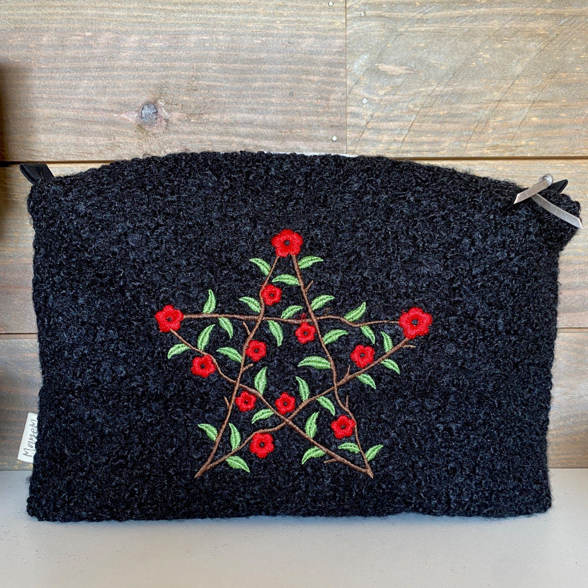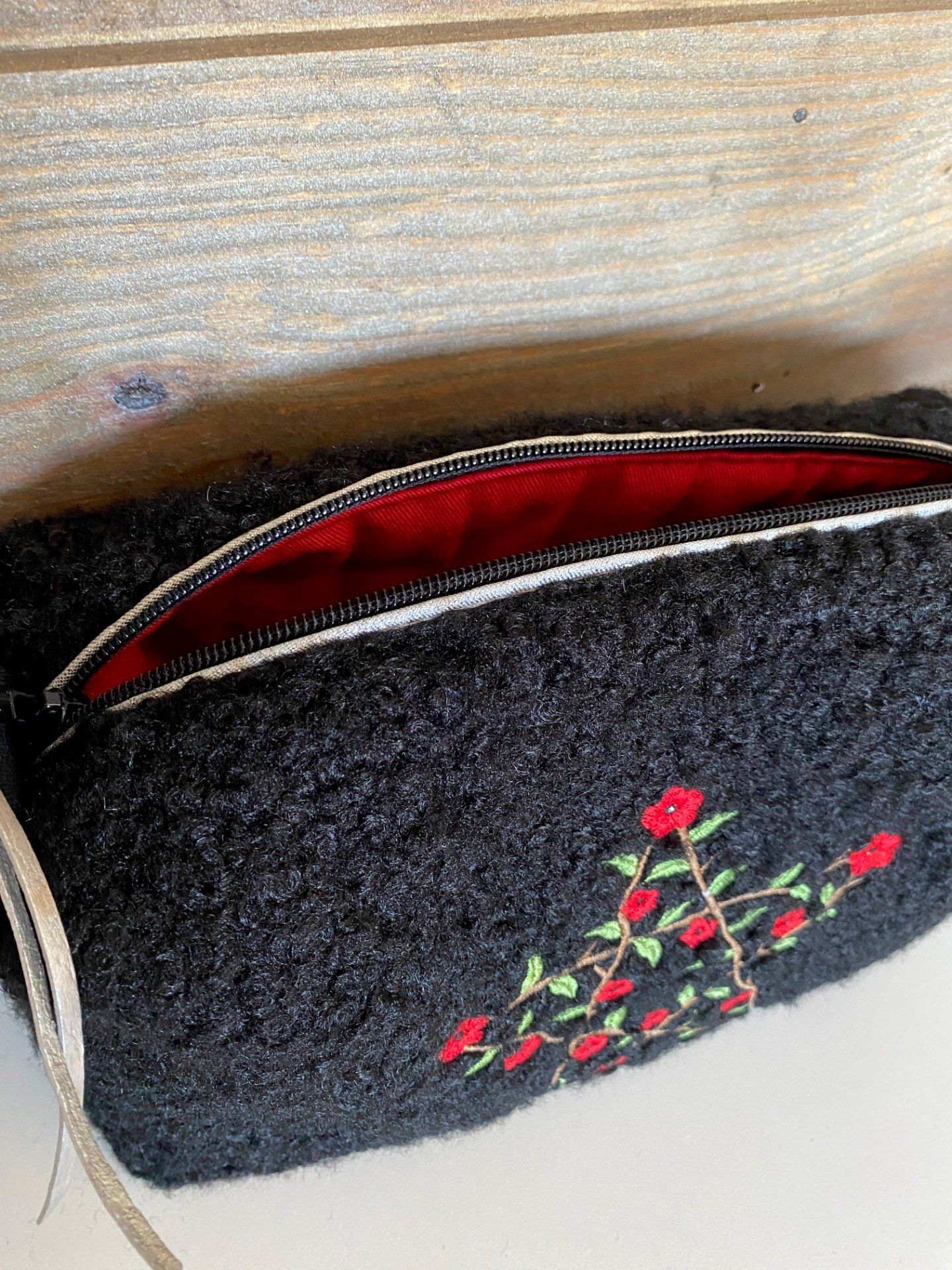 La trousse a été confectionnée à la main et brodée par mes soins.